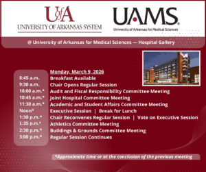LITTLE ROCK (March 4, 2026) — The Board of Trustees of the University of Arkansas will hold its regularly scheduled board meetings in person and via videoconference March 9 at the University of Arkansas for Medical Sciences (UAMS).